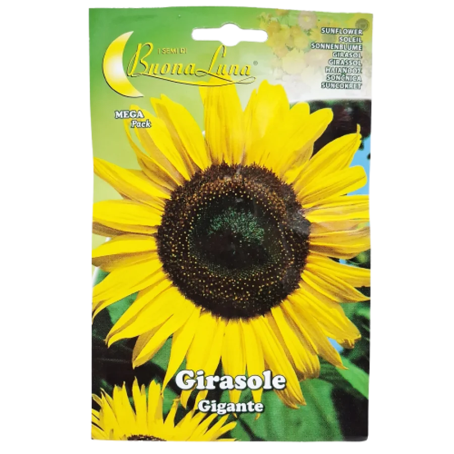 Αυτή η συσκευασία της Buona Luna περιέχει σπόρους Helianthus annuus giganteus, μια κλασική ποικιλία ψηλού ηλίανθου. Γεωπονικά, ο Helianthus annuus είναι ένα ετήσιο φυτό της οικογένειας των Αστεροειδών (Asteraceae). Η συγκεκριμένη ποικιλία “Gigante” διακρίνεται για τη ζωηρή της ανάπτυξη, ικανή να φτάσει σε ύψος τα 2-3 μέτρα (ή και περισσότερο σε ιδανικές συνθήκες) και να παράγει μία, κεντρική, τεράστια ταξιανθία (κεφαλή).