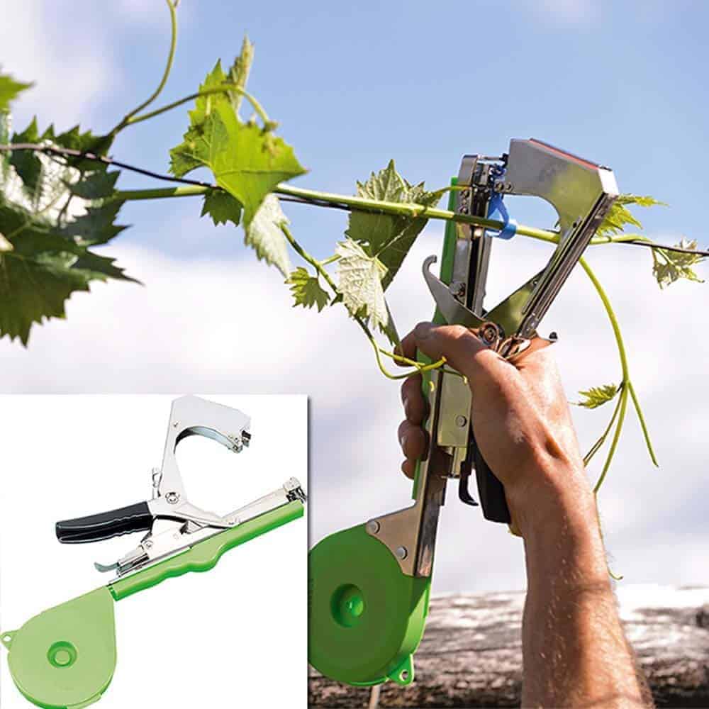 Δετικό εργαλείο που δένει και συγκρατεί το αμπέλι ή άλλα μικρά φυτά, φρούτα και λαχανικά (τομάτες, αγγούρια φασόλια, κ.λ.π) με μία απλή και εύκολη κίνηση. Ιδανικό και εύκολο στη στερέωση κλαδιών και φυτών σε φυτώρια, θερμοκήπια, κηπευτικές καλλιέργειες, αγρούς και για δέσιμο δεμάτων κλαδιών ή κομμένων λουλουδιών μικρής και μεγάλης διαμέτρου. Είναι ένα πολύ χρήσιμο εργαλείο για παραγωγούς, επαγγελματίες καλλιεργητές, για φυτώρια και για τον κήπο. Μπορούμε να δένουμε στα πασσαλάκια (καλάμια) τα κλαδιά και τους μίσχους των φυτών ξεκούραστα και σε ελάχιστο χρόνο με τις ειδικές ταινίες και τους συνδετήρες που χρησιμοποιεί. Η στερέωση γίνεται με συρραπτικούς συνδετήρες ενώ η ελαστική ταινία δεν πληγώνει τα φυτά καθώς αυτά αναπτύσσονται. Διατίθονται επίσης και ανταλακτικές ταινίες δεσίματος σε μπλέ ή κόκκινο χρώμα καθώς και συνδετήρες εξτρά.