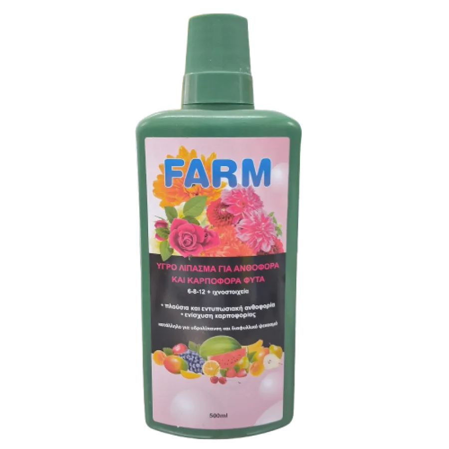 Το υγρό λίπασμα της σειράς FARM από την Primasem δρα άμεσα στο μεταβολισμό των φυτών, προάγοντας τον σχηματισμό υγιών και ευωδιαστών ανθέων, καθώς και τη διατήρηση της ποιότητας των καρπών. Είναι κατάλληλο τόσο για υδρολίπανση (πότισμα) όσο και για διαφυλλικούς ψεκασμούς.