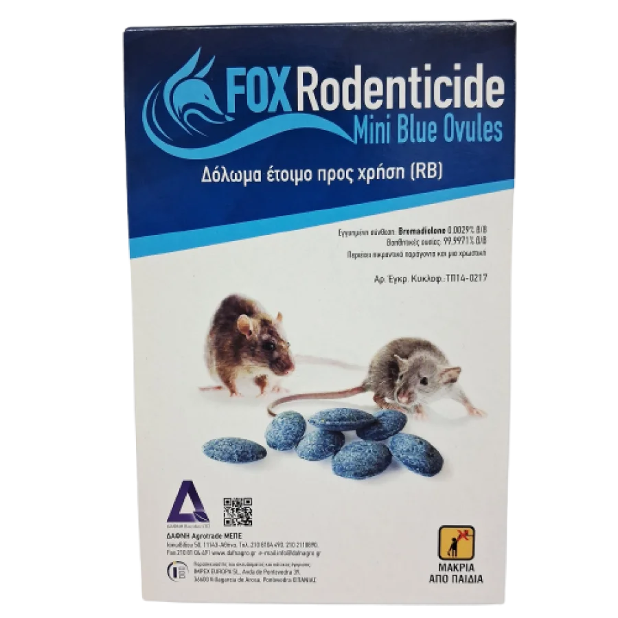 Το FOX Rodenticide αποτελεί μια αξιόπιστη λύση για τον έλεγχο των τρωκτικών σε αστικούς και αγροτικούς χώρους. Η μορφή του (Mini Blue Ovules) είναι σχεδιασμένη για μέγιστη ελκυστικότητα, συνδυάζοντας θρεπτικά συστατικά που προσελκύουν τα τρωκτικά ακόμα και σε περιβάλλοντα με άφθονη τροφή.