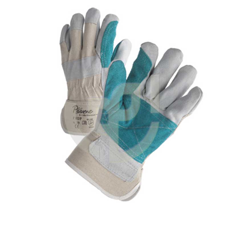 Δέρμα, πράσινη ενίσχυση. Κρούτα μόσχου με ενίσχυση παλάμης και αντίχειρα. Πίσω μέρος βαμβακερό. Μανσέτα από καμβά.