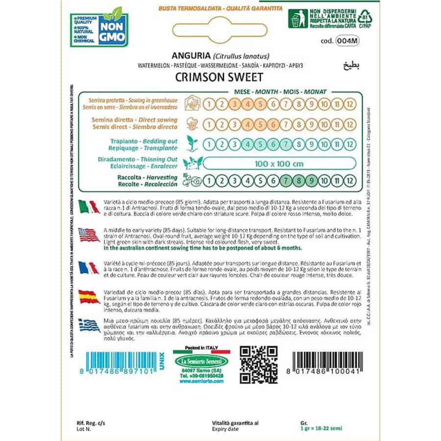 Το Crimson Sweet είναι μια δημοφιλής, μεσοπρώιμη ποικιλία καρπουζιού γνωστή για την εξαιρετική ποιότητα της σάρκας και τη σταθερή παραγωγικότητά της. Ωριμάζει περίπου σε 85 ημέρες, προσφέροντας καρπούς ιδανικούς για εμπορική αλλά και ερασιτεχνική καλλιέργεια.