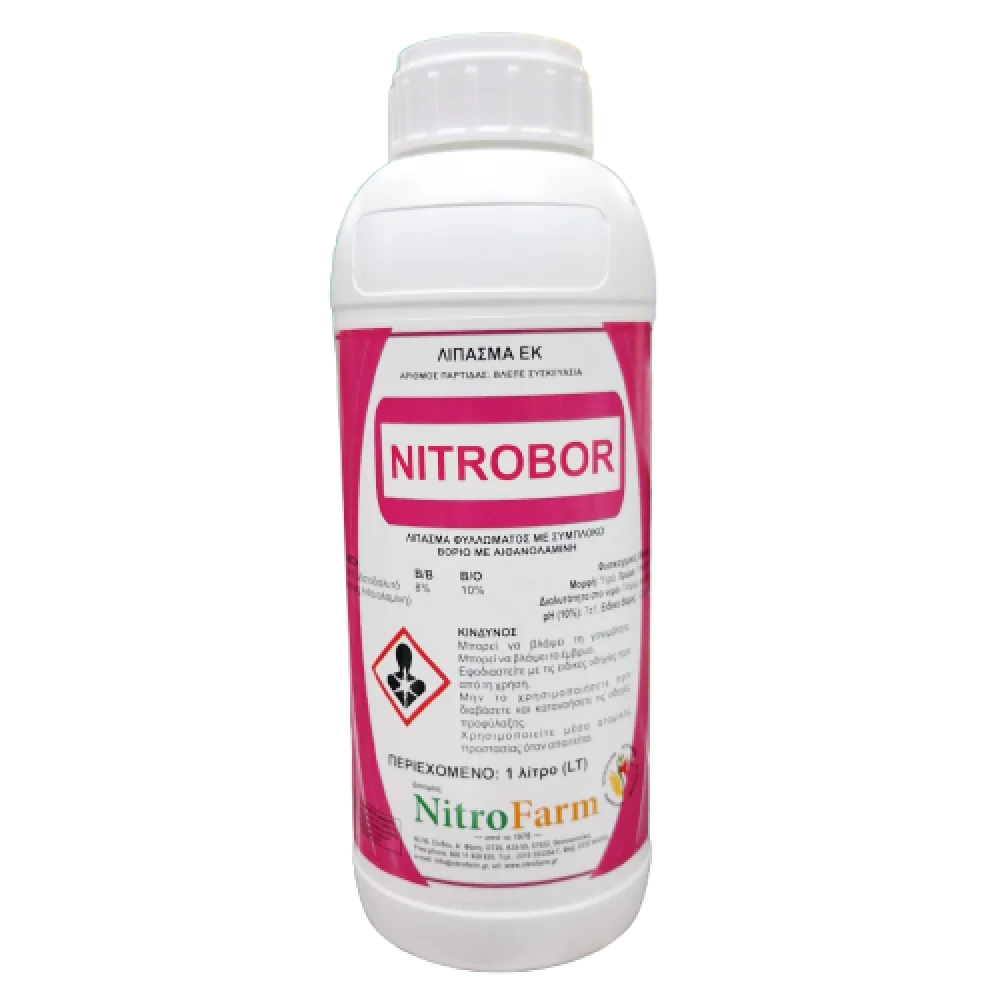 ​Το NITROBOR αποτελεί την ιδανική λύση για την πρόληψη και θεραπεία τροφοπενιών βορίου σε απαιτητικές καλλιέργειες όπως η ελιά, το αμπέλι, τα τεύτλα και τα οπωροφόρα. Η ειδική του σύνθεση με βόριο σε μορφή βοριούχου αιθανολαμίνης (8% β/β, 10% β/ό) το καθιστά εξαιρετικά βιοδιαθέσιμο και αποτελεσματικό.