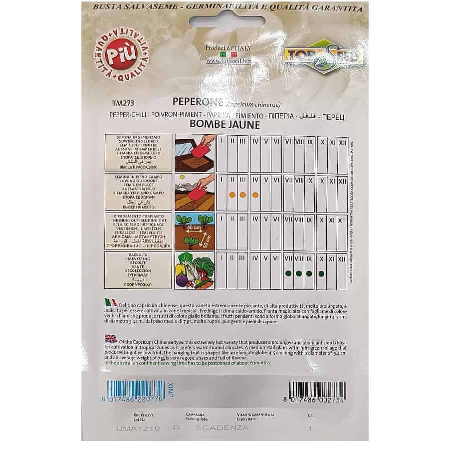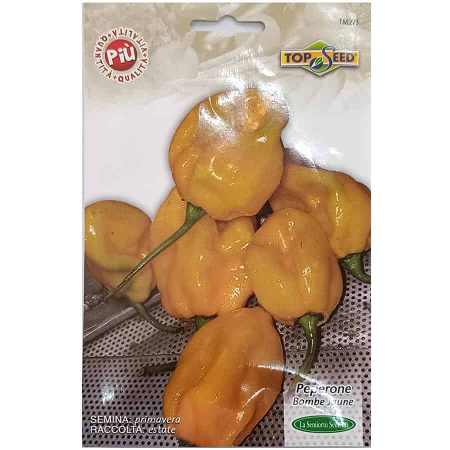 Η πιπεριά Bombé Jaune είναι ποικιλία τύπου Capsicum Chinense, γνωστή για την έντονη πικάντικη γεύση της και την υψηλή παραγωγικότητά της. Το φυτό είναι μέτρια ψηλό, με ανοιχτοπράσινο φύλλωμα που καλύπτει καλά τους καρπούς. Οι καρποί κρέμονται και έχουν σφαιροειδές-επιμηκές σχήμα, μήκους 4-5 εκ., διαμέτρου 3-4 εκ., και μέσο βάρος 7 γρ. Είναι πολύ ρυτιδωμένοι, πικάντικοι και γεμάτοι γεύση, κατάλληλοι για χρήση σε τροπικά κλίματα και εξαιρετικά ανθεκτικοί σε παρατεταμένες περιόδους παραγωγής.