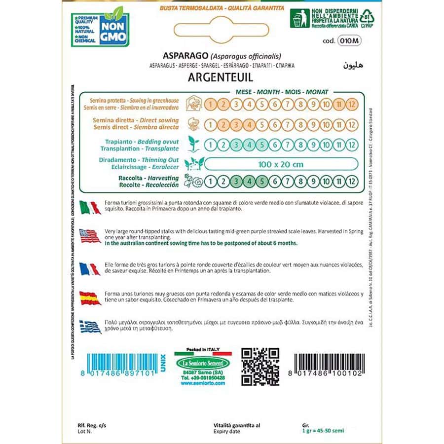 Το Argenteuil (Asparagus officinalis) είναι μια ποικιλία σπαραγγιού γνωστή για τους πολύ μεγάλους, ορθογώνιους μίσχους και τα πράσινο-μωβ φύλλα με ευχάριστο άρωμα και γεύση. Ιδανική για επαγγελματική καλλιέργεια και φρέσκια κατανάλωση.