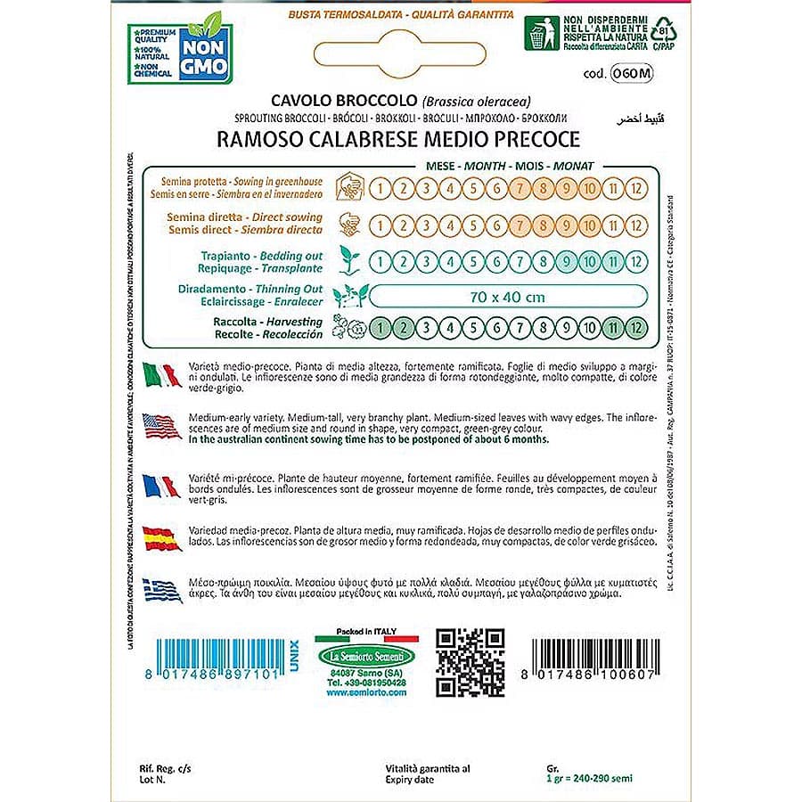 Το μπρόκολο Ramoso Calabrese Medio Precoce (Brassica oleracea) είναι μια μέσο-πρώιμη ποικιλία με μεσαίου ύψους φυτό που αναπτύσσει πολλά κλαδιά. Τα φύλλα είναι μεσαίου μεγέθους με κυματιστές άκρες, ενώ τα άνθη είναι μεσαίου μεγέθους, κυκλικά, πολύ συμπαγή, με γαλαζοπράσινο χρώμα, ιδανικά για φρέσκια κατανάλωση ή μαγείρεμα.