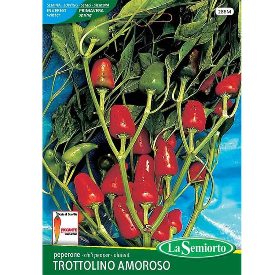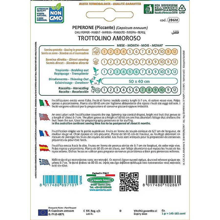 Η καυτερή πιπεριά Trottolino Amoroso χαρακτηρίζεται από κάθετη ανάπτυξη και καρποφορία προς την κορυφή. Οι καρποί έχουν κωνικό σχήμα, μήκος 5–7 εκ., φωτεινό κόκκινο χρώμα και παχιά, πολύ καυτερή σάρκα. Το φυτό φτάνει σε ύψος 60–65 εκ., με άφθονο φύλλωμα που καλύπτει και προστατεύει τους καρπούς από τον ήλιο.