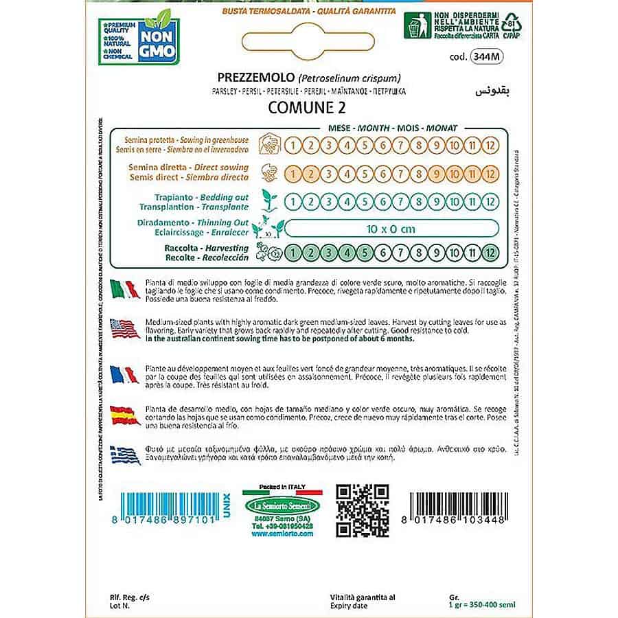 Ο μαϊντανός COMUNE 2 είναι ζωηρό και παραγωγικό φυτό με μεσαία φύλλα, σκούρο πράσινο χρώμα και χαρακτηριστικό άρωμα. Αντέχει σε χαμηλές θερμοκρασίες και μπορεί να συγκομιστεί πολλές φορές χάρη στην ταχεία και επαναλαμβανόμενη ανάπτυξή του. Ιδανική επιλογή για φρέσκο μαϊντανό, μαγειρική, γαρνιτούρες και επεξεργασία.