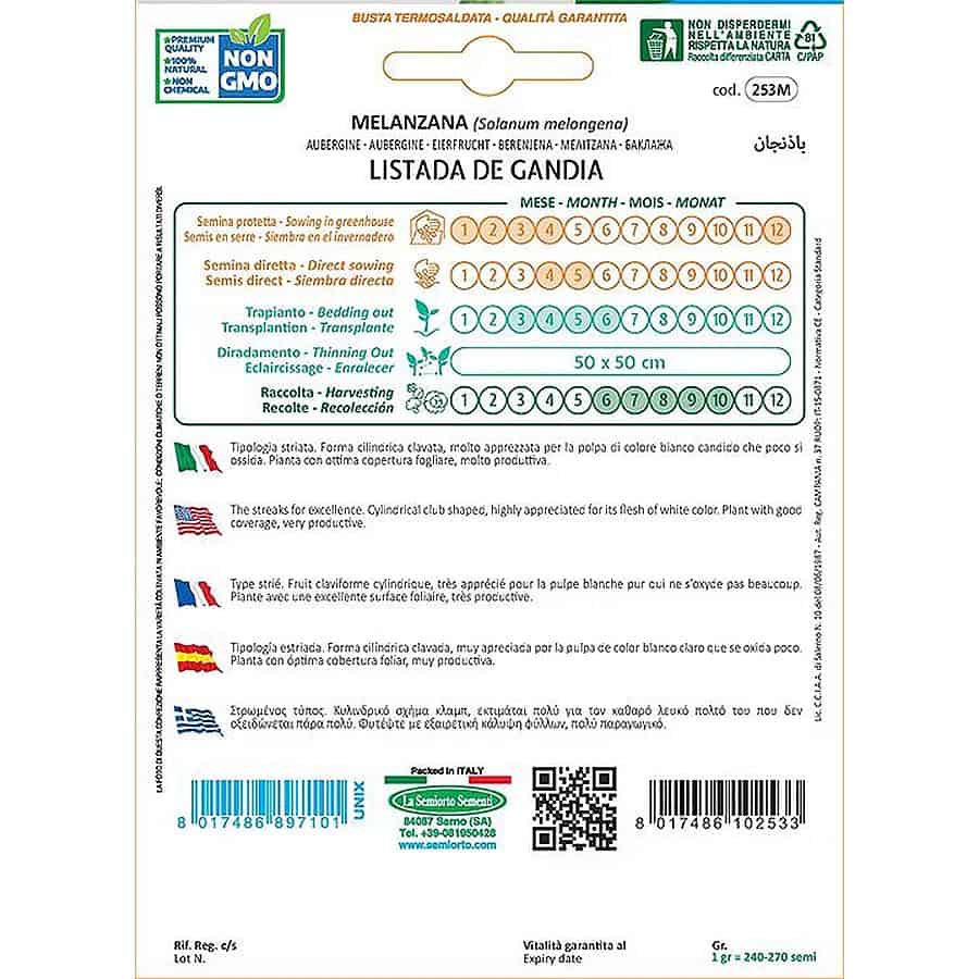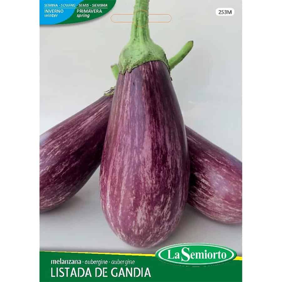 Η μελιτζάνα Listada de Gandia είναι μία από τις πιο χαρακτηριστικές ριγέ ποικιλίες, γνωστή για τη μοναδική εμφάνιση και την υψηλή ποιότητα της σάρκας της. Οι καρποί έχουν κυλινδρικό–κλαμπ σχήμα, με εντυπωσιακές μωβ–λευκές ρίγες , πολύ αργά οξειδούμενη σάρκα, που την κάνει ιδανική για μαγείρεμα και γαστρονομικές εφαρμογές.