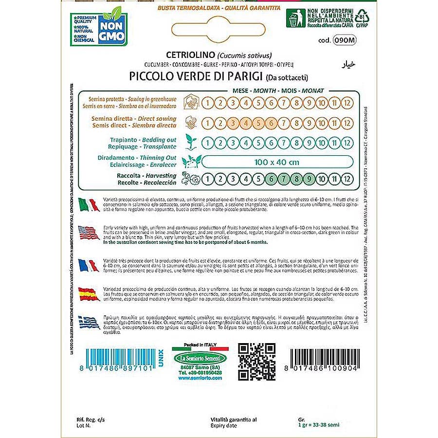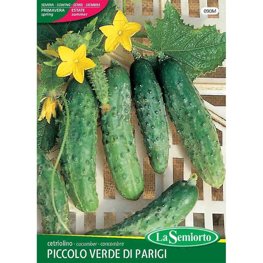 ο μικρό αγγούρι Piccolo Verde di Parigi (Cucumis sativus) είναι μια πρώιμη ποικιλία με ομοιόμορφους καρπούς μεγάλου ρυθμού παραγωγής. Η συγκομιδή γίνεται όταν οι καρποί φτάσουν τα 6-10 εκ. Το δέρμα είναι λεπτό με πολλές προεξοχές, οι καρποί είναι επιμήκεις, τριγωνικής διατομής και σκούρο πράσινοι με αμβλεία άκρη.