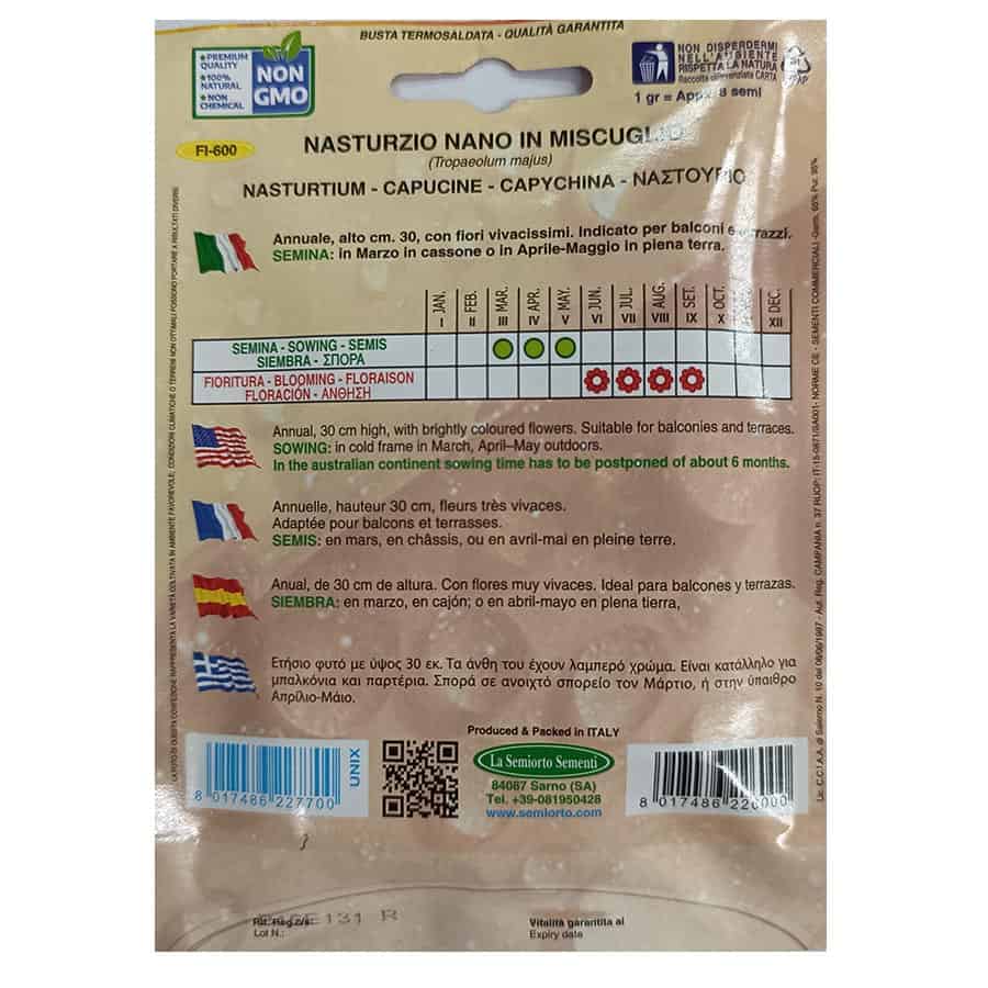 Ναστούριο NANO είναι ετήσιο φυτό που φτάνει σε ύψος περίπου 30 εκ. και παράγει εντυπωσιακά, φωτεινά άνθη σε ποικιλία χρωμάτων, ιδανικά για διακοσμητικά σημεία σε μπαλκόνια, βεράντες ή παρτέρια. Η σπορά γίνεται σε ανοιχτό σπορείο τον Μάρτιο ή απευθείας στην ύπαιθρο από Απρίλιο έως Μάιο. Προτιμά ηλιόλουστες θέσεις και καλά στραγγιζόμενο έδαφος για πλούσια ανθοφορία.