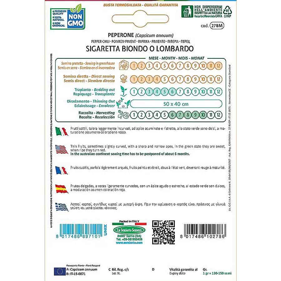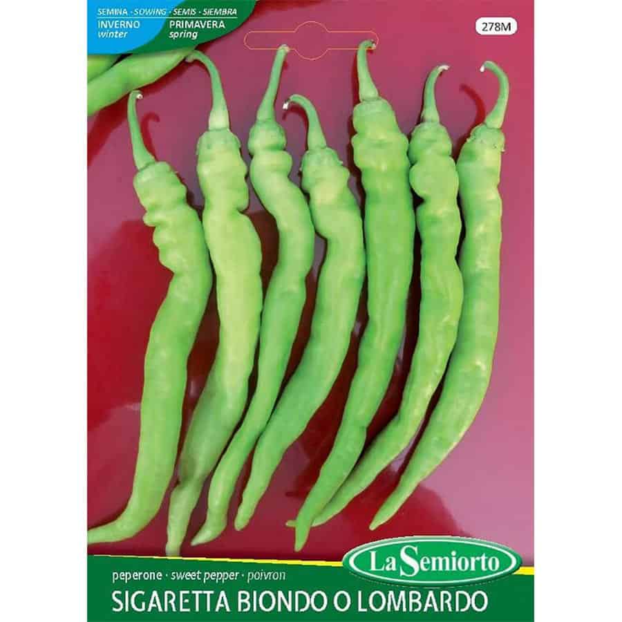 Η πιπεριά Sigaretta Biondo / Lombardo παράγει λεπτούς, επιμήκεις καρπούς με μυτερή και στενή άκρη. Οι καρποί είναι συνήθως ελαφρώς κυρτοί πράσινοι με ΗΜΙΚΑΥΤΕΡΗ γεύση. Με την ωρίμανση, οι καρποί αποκτούν έντονο κόκκινο χρώμα και παραμένουν τρυφεροί και εύγευστοι. Το φυτό είναι παραγωγικό και εύκολο στη διαχείριση, κατάλληλο για εμπορική παραγωγή, υπαίθρια ή σε θερμοκήπιο.