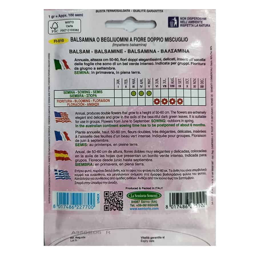 Ποικιλία βαλσαμίνας με διπλά, εντυπωσιακά άνθη και ύψος 50-60 εκ. Το φυτό αναπτύσσεται σε όμορφες ομάδες με βαθυπράσινα φύλλα και είναι κατάλληλο για συνθέσεις από ομάδες ανθέων. Ανθίζει από τον Ιούνιο έως τον Σεπτέμβριο. Σπορά στην ύπαιθρο την άνοιξη.
