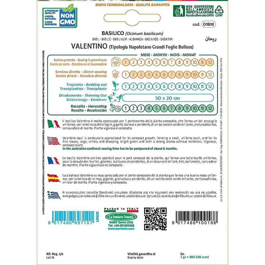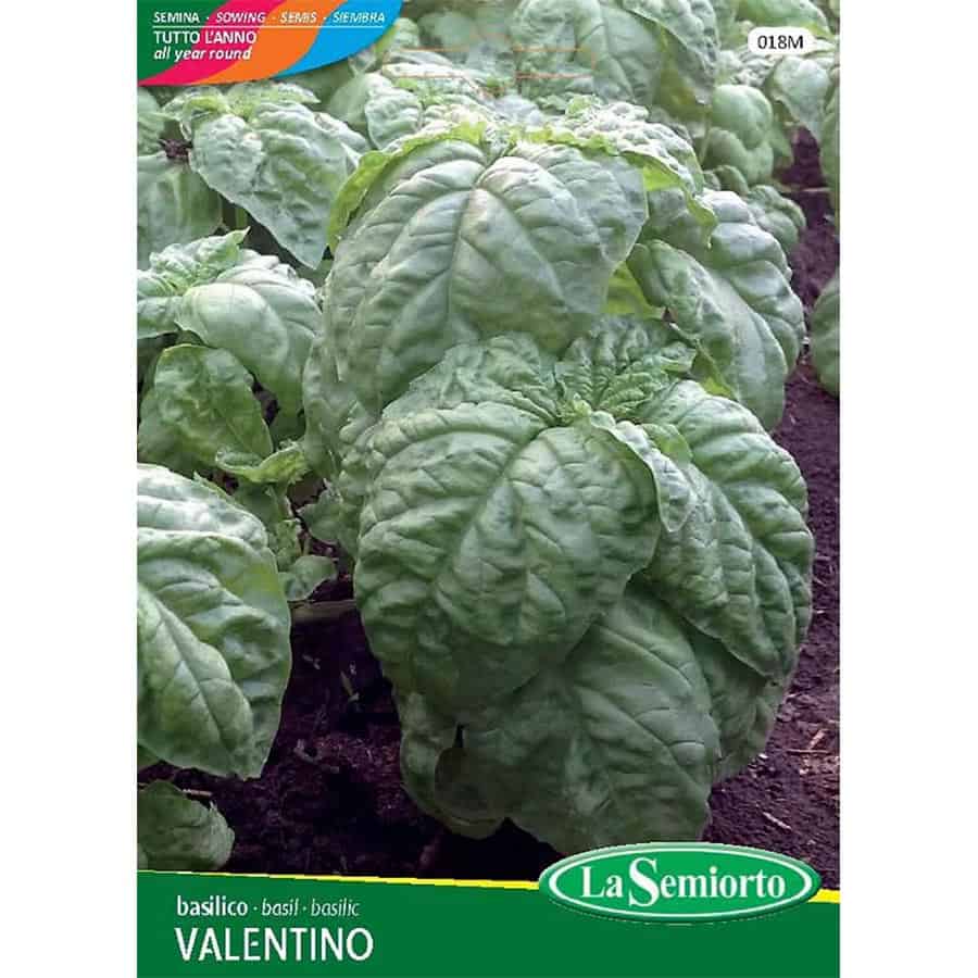 Το Valentino (Tipologia Napoletano, Ocimum basilicum) είναι μια ποικιλία βασιλικού που εκτιμάται ιδιαίτερα για τη συμπαγή ανάπτυξή της και τα μεγάλα, ανοικτόχρωμα πράσινα φύλλα με έντονο, ευχάριστο άρωμα. Το φυτό σχηματίζει ομοιόμορφο θάμνο με πλούσιο φύλλωμα, προσφέροντας σταθερή παραγωγή και υψηλή ποιότητα φύλλων.