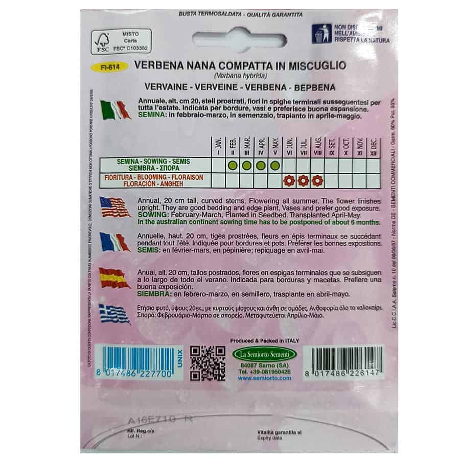 Η Βερβένα NANA COMPATTA είναι ετήσιο φυτό που φτάνει τα 20 εκ. ύψος, με συμπαγείς, κυρτούς μίσχους και πυκνές ταξιανθίες από μικρά άνθη. Προσφέρει πλούσια και διαρκή ανθοφορία καθ’ όλη τη διάρκεια του καλοκαιριού, καθιστώντας την ιδανική για παρτέρια, γλάστρες και ανθοσυνθέσεις. Η σπορά γίνεται σε σπορείο τον Φεβρουάριο-Μάρτιο, με μεταφύτευση στην ύπαιθρο ή σε γλάστρες τον Απρίλιο-Μάιο.