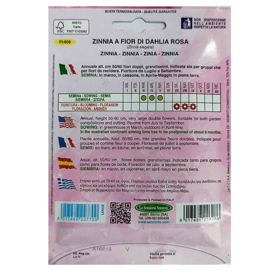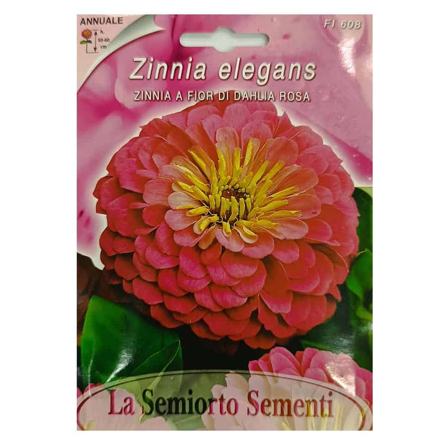 Η Ζίννια A FIOR DI DAHLIA ROSA είναι ετήσιο φυτό που φτάνει σε ύψος 50-60 εκ. και παράγει πλούσια, μεγάλα διπλά άνθη ροζ χρώματος. Κατάλληλο για παρτέρια, ανθοσυνθέσεις σε κήπους και για κόψιμο, προσφέροντας εντυπωσιακή και μακρά ανθοφορία από τον Ιούλιο έως τον Σεπτέμβριο. Η σπορά γίνεται σε θερμοκήπιο τον Μάρτιο για νωρίτερη ανάπτυξη ή απευθείας στην ύπαιθρο τον Απρίλιο-Μάιο. Προτιμά ηλιόλουστες θέσεις και καλά στραγγιζόμενο έδαφος.