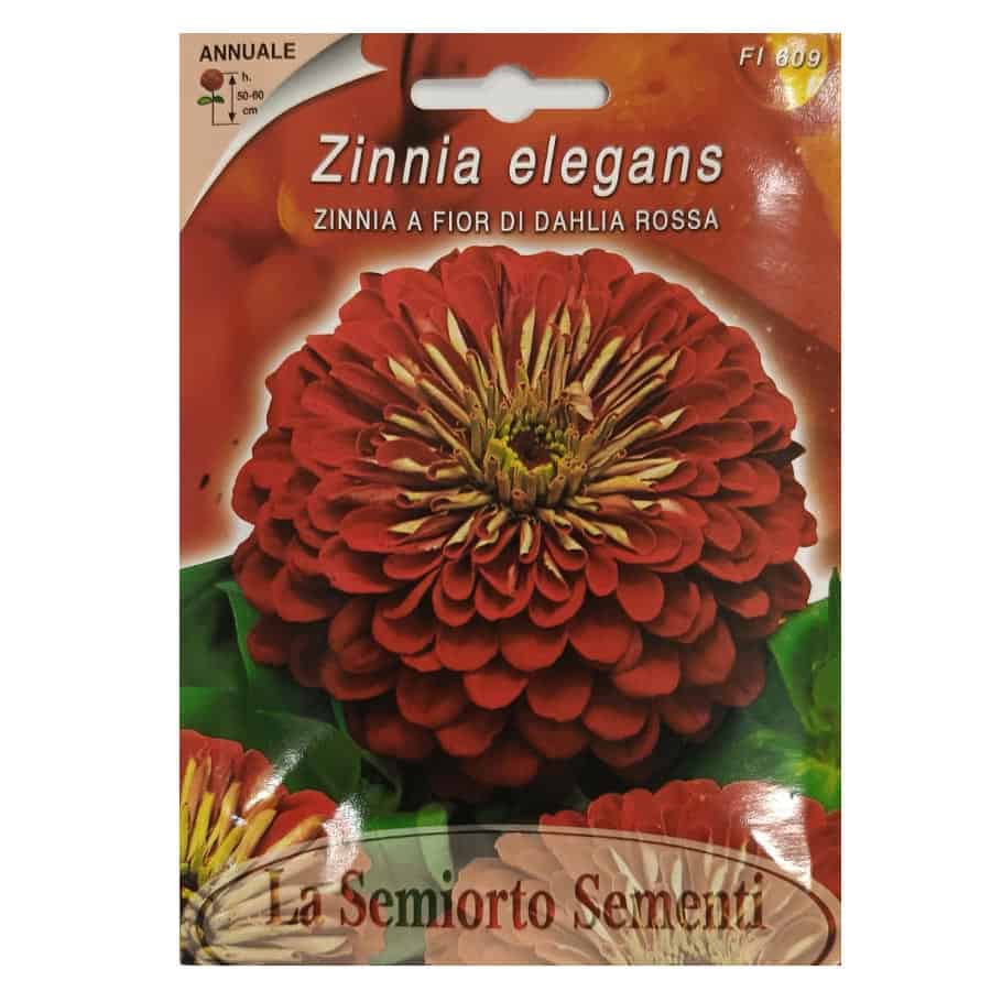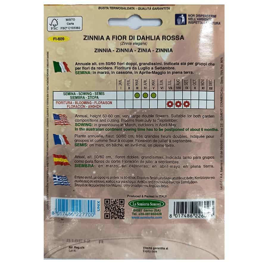 Η Ζίννια A FIOR DI DAHLIA ROSSA είναι ετήσιο φυτό που φτάνει σε ύψος 50-60 εκ. και παράγει πλούσια, μεγάλα διπλά άνθη κόκκινου χρώματος. Κατάλληλο για παρτέρια, ανθοσυνθέσεις σε κήπους και για κόψιμο, προσφέροντας εντυπωσιακή και μακρά ανθοφορία από τον Ιούλιο έως τον Σεπτέμβριο. Η σπορά γίνεται σε θερμοκήπιο τον Μάρτιο για νωρίτερη ανάπτυξη ή απευθείας στην ύπαιθρο τον Απρίλιο-Μάιο. Προτιμά ηλιόλουστες θέσεις και καλά στραγγιζόμενο έδαφος.