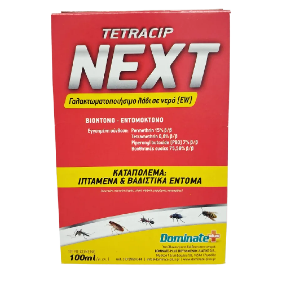 To Tetracip Next αποτελεί μια ολοκληρωμένη λύση για την απεντόμωση κατοικημένων χώρων, συνδυάζοντας τρεις δραστικές ουσίες για μέγιστο “knock-down” αποτέλεσμα. Η ειδική του σύνθεση ως γαλάκτωμα λαδιού σε νερό (EW) το καθιστά φιλικότερο στη χρήση, διατηρώντας παράλληλα τη δραστικότητά του σε διάφορες επιφάνειες.