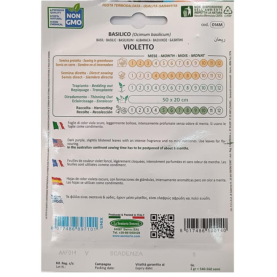 Το Violetto (Ocimum basilicum) είναι μια ιδιαίτερη ποικιλία βασιλικού, γνωστή για τα σκούρα, ιώδη φύλλα της με μεσαίο μέγεθος. Τα φύλλα είναι ελαφρώς αφρώδη και διαθέτουν έντονο και ευχάριστο άρωμα, κάνοντάς την κατάλληλη για χρήση σε σαλάτες, σάλτσες και άλλα πιάτα.
